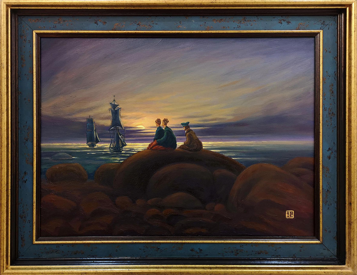 油画主题:临摹弗里德里希(Friedrich)的作品《海上升明月 Moonrise over the Sea》画布尺寸:40cmx30cm完成时间:2024.11.25